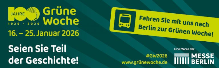Mit dem Reisebus bequem die ganze Welt entdecken? Mit uns geht das! Starten Sie Ihre kulinarische Reise auf der Grünen Woche in Berlin. Seit 1926 ist die traditionsreiche Messe für Ernährung, Landwirtschaft und Gartenbau international einzigartig und feiert in 2026 ihr 100-jähriges Jubiläum. Produkte von rund 1.400 Ausstellern aus 50 Ländern zeigen, was die faszinierende Welt der Nahrungs- und Genussmittel zu bieten hat – international – innovativ – nachhaltig – vielfältig – kulinarisch!